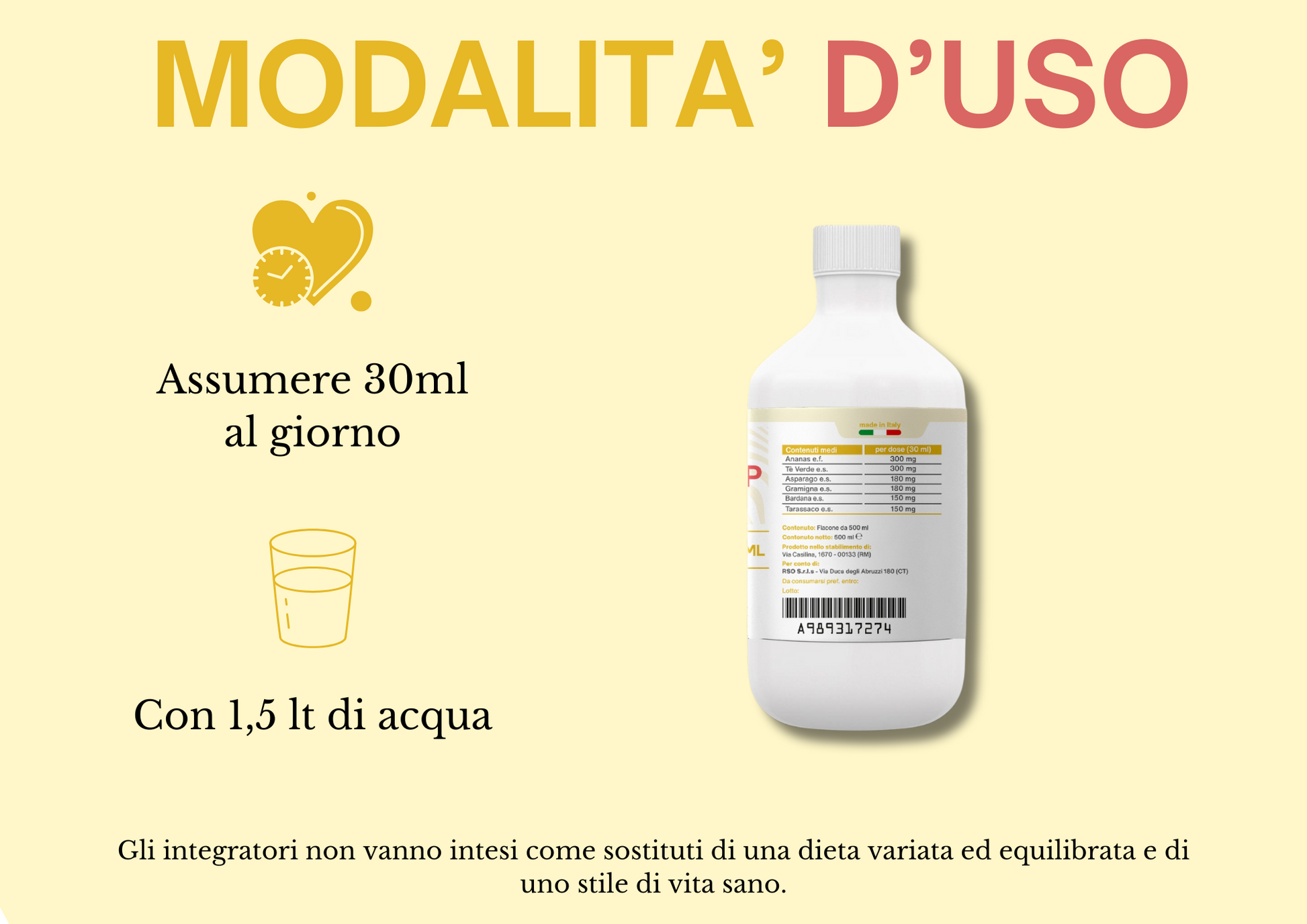 How to take Drenamap and nutritional strategies: It is recommended to dissolve 2/3 scoops, equal to approximately 40ml of product, in 1.5 litres of low-sodium water, to be sipped throughout the day.